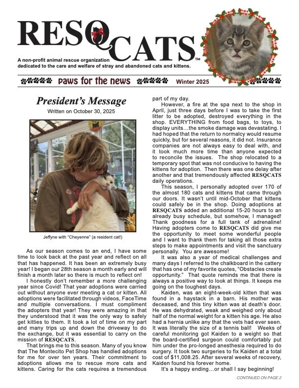 Our Newsletters 2025 Summer2020 Winter2019 Winter2019 Spring2018 Winter2017 Winter2016 Winter2015 Winter2014 Summer/Fall2013 Fall2012 Fall2011 Fall2010 Summer2009 Fall2008 Fall2007 Fall2006 Fall2005 Fall 2025 Winter2021 Winter2021 Spring2018 Spring2017 Spring2016 Summer2014 Winter/Fall2013 Winter2012 Winter2011 Holiday2010 Holiday2009 Holiday2008 Holiday2007 Holiday 2006 Holiday2005 Holiday 2024 Summer2023 Winter2023 Spring2022 Winter2022 Spring2018 Summer2017 Fall2016 Fall2015 Fall2014 Spring2013 Spring2012 Summer2011 Summer2010 Spring2009 Spring2008 Spring2007 Summer2006 Summer2005 Summer Subscribe to our Newsletters Sign up with your email address to receive newsletters and updates about ResQcats. First Name Last Name Email Address Sign Up We respect your privacy. Thank you!
